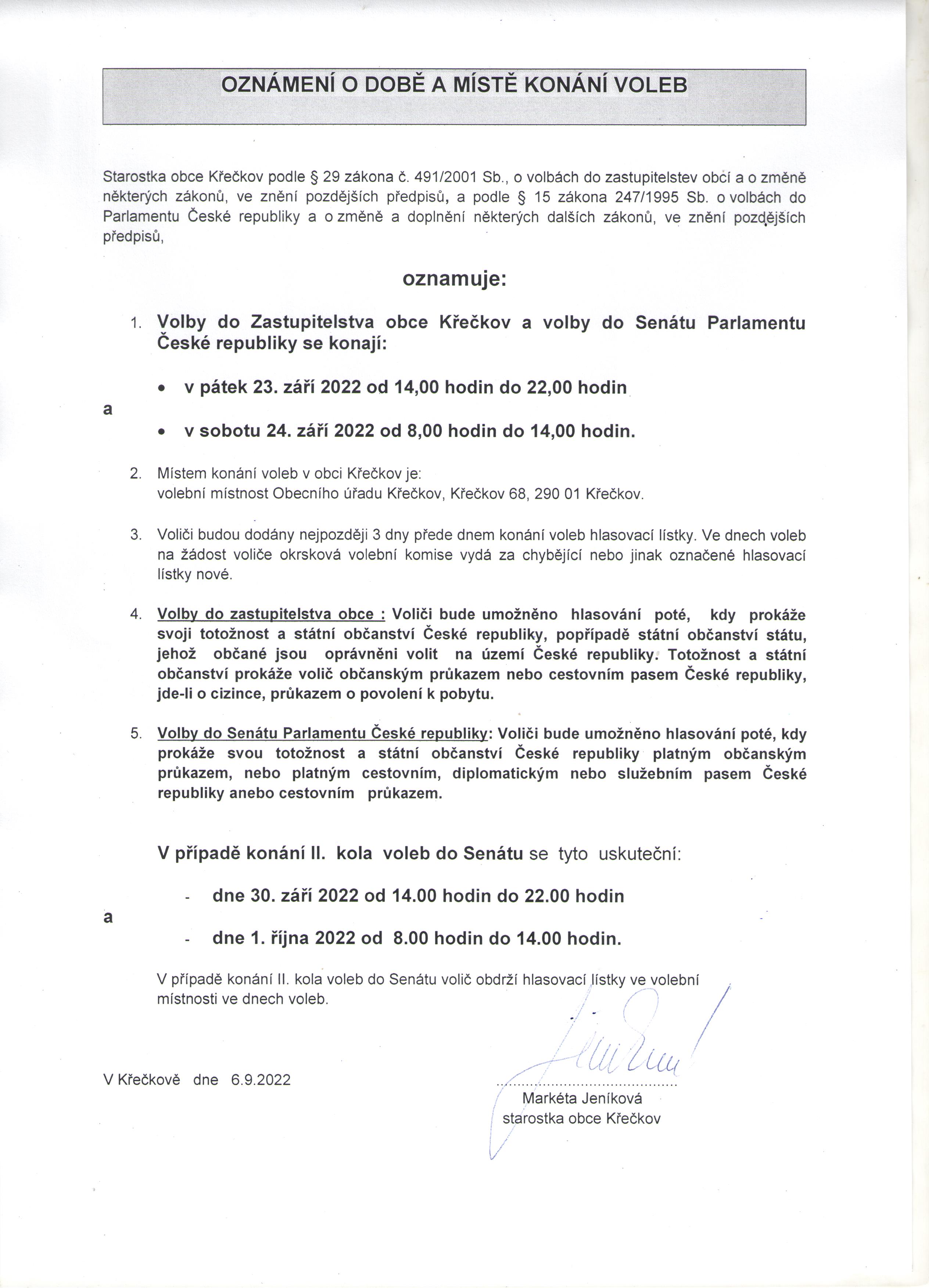 Oznámení o době a místě konání voleb
